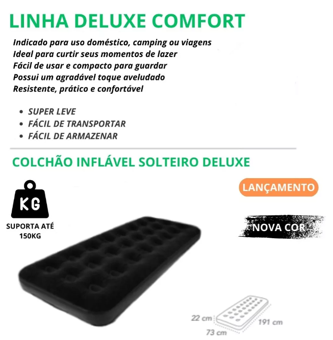 Colchão Inflável Solteiro Deluxe Confort Preto 1,91m x 73cm x 22cm – Bel